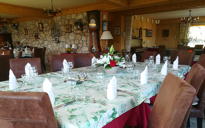 The restaurant is harmoniously decorated in wood and local stone. Hand painted cupboards and Savoie furniture set the tone of the friendly atmosphere for the cuisine served here and on the terrace.